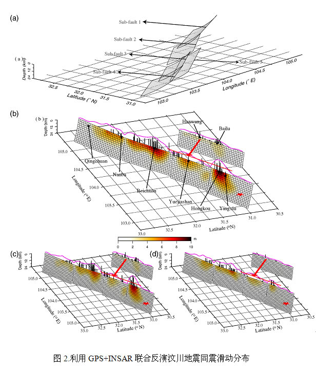 2)利用GPS/InSAR数据,同时顾及各类观测权匹配与地壳分层结构进行汶川地震滑动分布反演, 发展了融合空间遥感与地面变形资料约束断层几何与运动参数的反演算法, 达到了改善地面观测密度、提高地震破裂模型空间分辨率的目的。